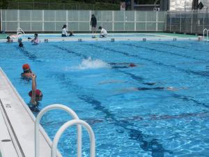 最初に小プールで全員で水慣れをした後、グループに分かれて、それぞれのめあてのもと、練習に取り組みました。