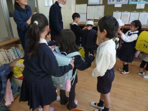 次は、「小学生になってみよう」です。年長さんに小学校の制服を着せてランドセルも背負ってもらいました。