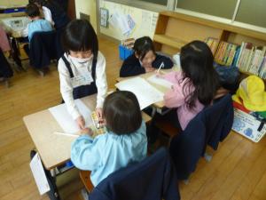 続いて、自分たちが小学校に上がってできるようになったことを年長さんに教えます。漢字、計算、けん玉やコマ回し、楽器の演奏の4グループに分かれ、それぞれのグループが優しくそして分かりやすく教えていました。
