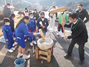 5年生が米作り学習の総仕上げとして餅つきを行いました。