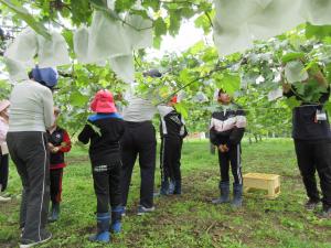 下学年から順番にどの房がいいかしっかり選び、袋をかけます。高学年が手伝って上手に袋かけをすることができました。