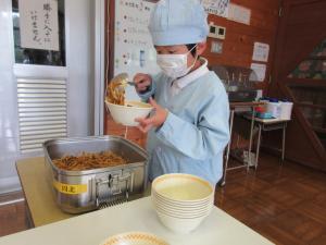 学年ごとに量の加減をしながら、できるだけ食缶に残さないようにつぎ分けるのはなかなか難しい作業です。担当の先生はなるべく手を出さず見守るようにしています。