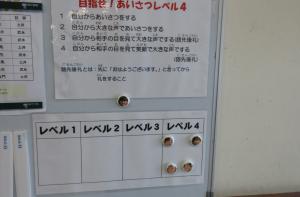 登校したらまず、あいさつボードで自分の「あいさつレベル」を振り返ります。