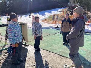 開会式で外部講師の方にご挨拶し、ファミリーゲレンデで軽くウォーミングアップを済ませたら、早速チャレンジリフトに乗って、センターコースのボトムを中心に学習を開始し、最終的にはセンタートップから滑るところまで学習を進めていきます。