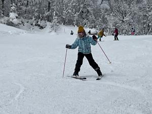 暖冬の青空の下、めがひらスキー場にて、第1回のスキー教室を行いました。人工降雪機のお陰で、積雪40cmという安定した環境でスキー教室が行えました。