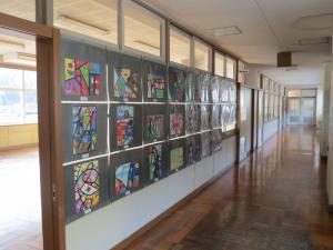3年生の廊下に美術の作品を展示しています。保護者の皆様には、卒業式後にご覧いただけると嬉しいです。一人ひとりの名前に込めた思いや思い出をデザインしています。